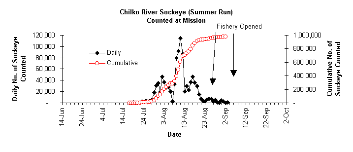 Daily and Cumulative counts of sockeye stocks passing the Mission Echo Sounding station during the summer of 1996. Information taken from the Pacific Salmon Commission.