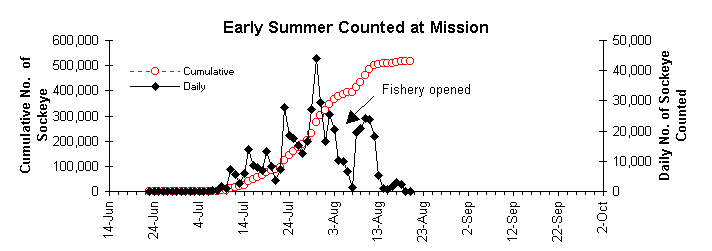 Daily and Cumulative counts of sockeye stocks passing the Mission Echo Sounding station during the summer of 1996. Information taken from the Pacific Salmon Commission.