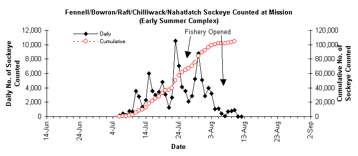 Daily and Cumulative counts of sockeye stocks passing the Mission Echo Sounding station during the summer of 1996. Information taken from the Pacific Salmon Commission.