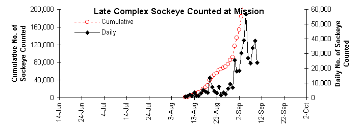 Daily and Cumulative counts of sockeye stocks passing the Mission Echo Sounding station during the summer of 1996. Information taken from the Pacific Salmon Commission.